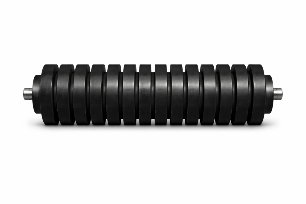 Projetado para o retorno da correia vazia, o rolete de retorno com anéis de borracha evita que resíduos se acumulem na superfície da correia.